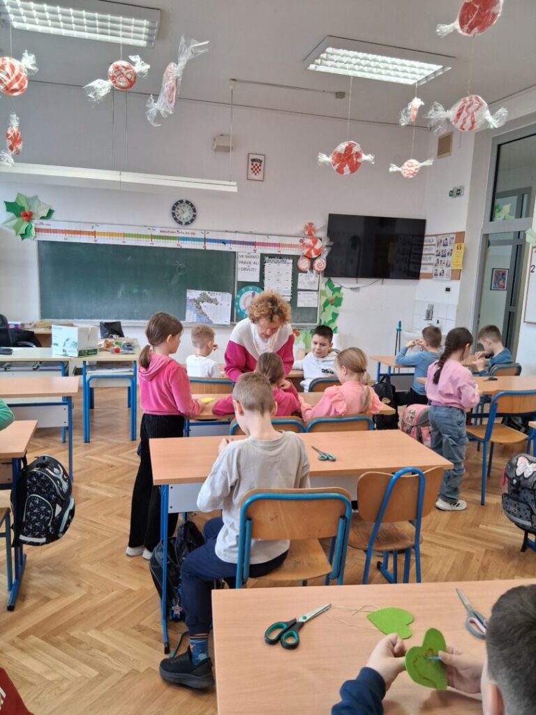 Učenici su se odvažno okušali u radu s iglom i koncem te izradili ukrasna srca povodom Valentinova.